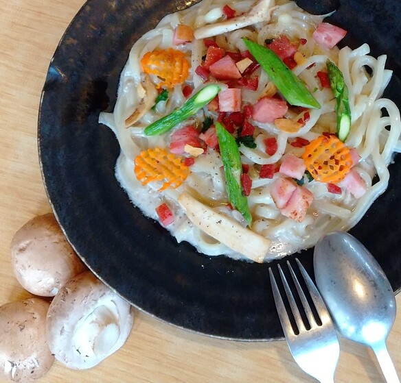『舟形マッシュルーム&角切りベーコンのクリームスープうどん』1,100円(税込)