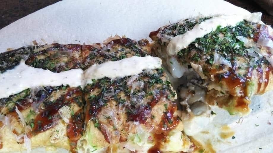 カキとホタテの周りに卵とチーズがとろ〜、柔らか〜い生地をふわ〜っとのせて、絶妙のタイミングでかえし、タルタルソースで仕上げます。