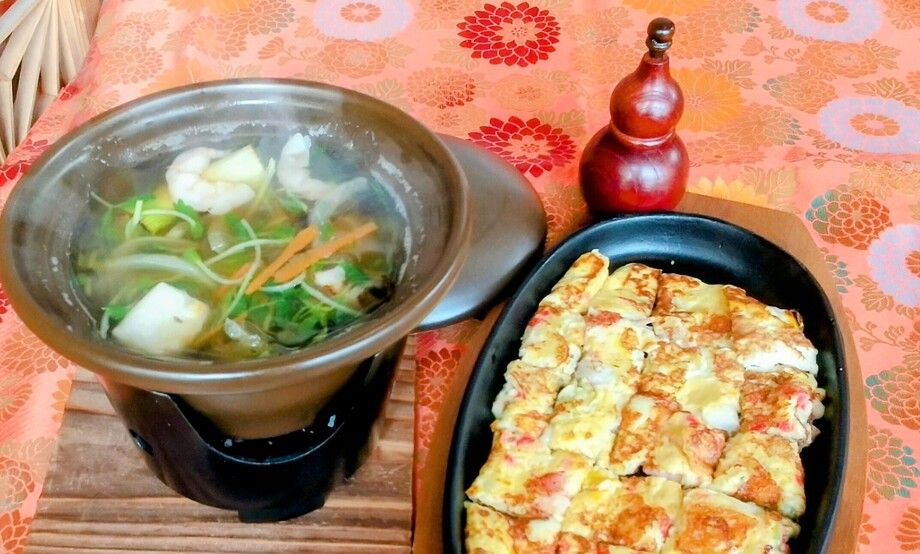 ゴーダチーズと長芋入りのふわふわお好み焼を、エビ・豆苗・岩のり入りの鍋の中に入れて、明石焼きのように召し上がれ!